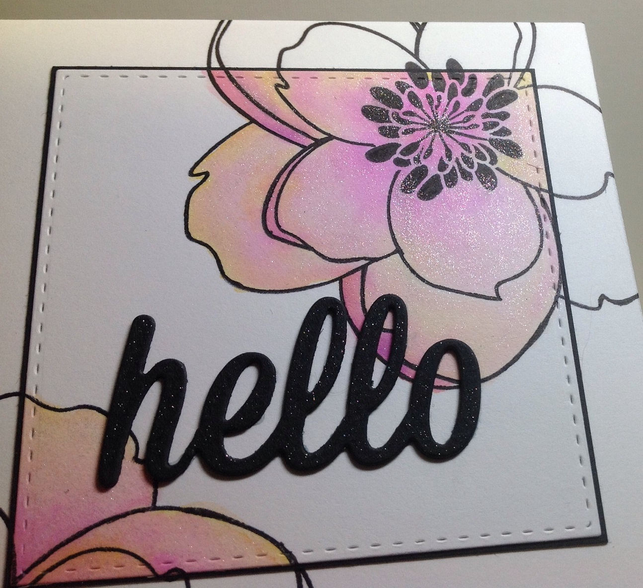 Anyway, I had a little play with my new Zig brush markers onto some Bristol smooth cardstock. Some people seem to like this combination, but of course this cs does not take water as well as watercolour cardstock. I stamped the Mondo Magnolia stamp (Essentials by EH) twice and played around to see how the Zig markers worked. The first image did not turn out the way I wanted (too much colour, too little water) but the second one turned out quite nicely. So I cut out a square containing the part I did like (using a SSS stitch rectange die) and matted that onto a square of black cs. I then used my MISTI to stamp the image again onto my card base making sure to line it up with the image on my square. To finish off, I cut the MFT hello die three times from black cardstock and adhered them together using Multi medium matte. And of course I could not resist adding a little clear Wink of Stella.