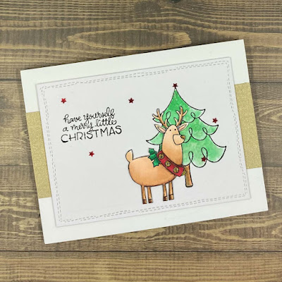 I used watercolours for the tree, while my MFT reindeer was coloured in using Copics. The band of gold glitter paper was also from my scraps.